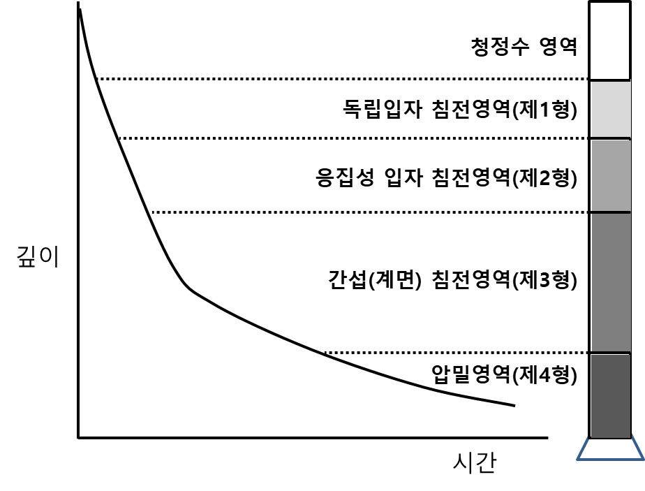 - 입자의 상태 및 수리적 거동에 따라 침강의 형태는 4가지(독립, 응집, 계면, 압밀)로 분류됨