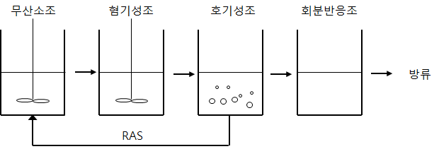 - 호기, 무산소, 호기의 공정조합으로 내부반송이 없고 연속주입, 연속배출 가능