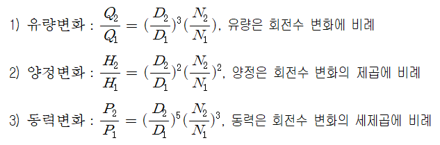 - 직경(D)과 회전수(N)가 동시에 변화할 때, 상사법칙을 통한 유량(Q), 양정(H), 동력(P)의 변화