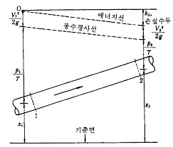 - 즉 손실이 있는 실제의 관 내의 흐름에 있어서 압력수두, 위치수두, 속도 수두의 합을 관에 따라 늘어 놓은 선