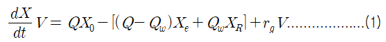 - 상기 그림의 완전혼합 반응조 내 미생물의 질량에 대한 질량수지는 다음과 같다.