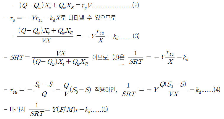 - 상기식에 따라 F/M비와 SRT는 반비례 관계임을 알 수 있음