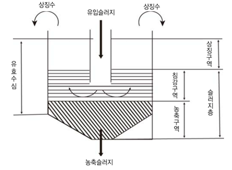 - 중력식 농축조에서 슬러지가 농축될 때 상징구역, 침강구역 그리고 농축구역의 세 부분이 형성되며 침강구역에서는 지역침전, 농축구역에서는 농축침전 발생