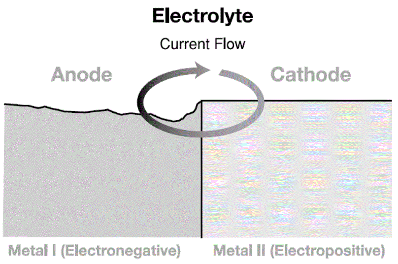 - 즉 전자는 음극이 되고 후자는 양극이 되며, 이러한 형태의 부식을 갈바닉 부식 또는 이종금속 접촉부식이라 함