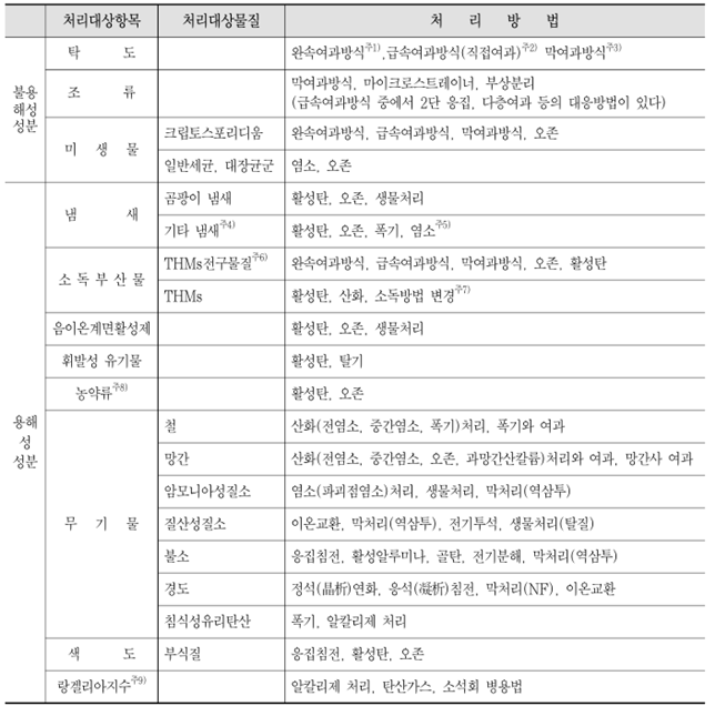 주7) : 이 표에서는 산화와 소독방법의 변경이란, 전염소처리방식으로부터 중간염소처리로 변경, 전염소․중간염소처리 에서 오존 등 다른 산화제로의 변경 및 유리염소로부터 결합염소로 소독방법을 변경하는 것을 말함