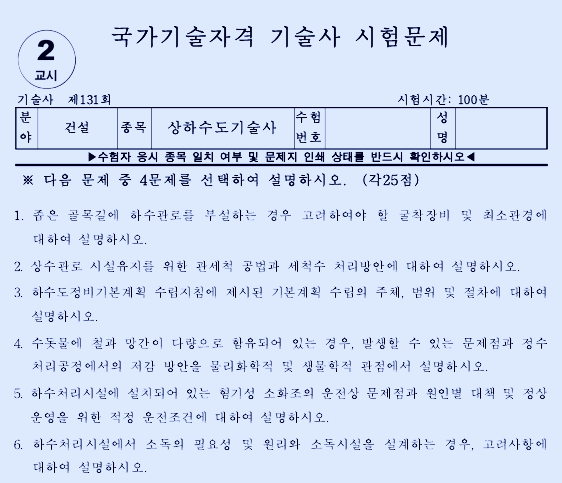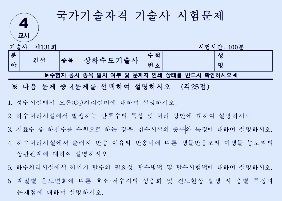 전반적으로 이번 131회 상하수도기술사 시험의 난이도는 높지 않았던 걸로 보입니다. 기출문제 위주로 준비하신 분들은 답안작성이 수월했을 것으로 보입니다.